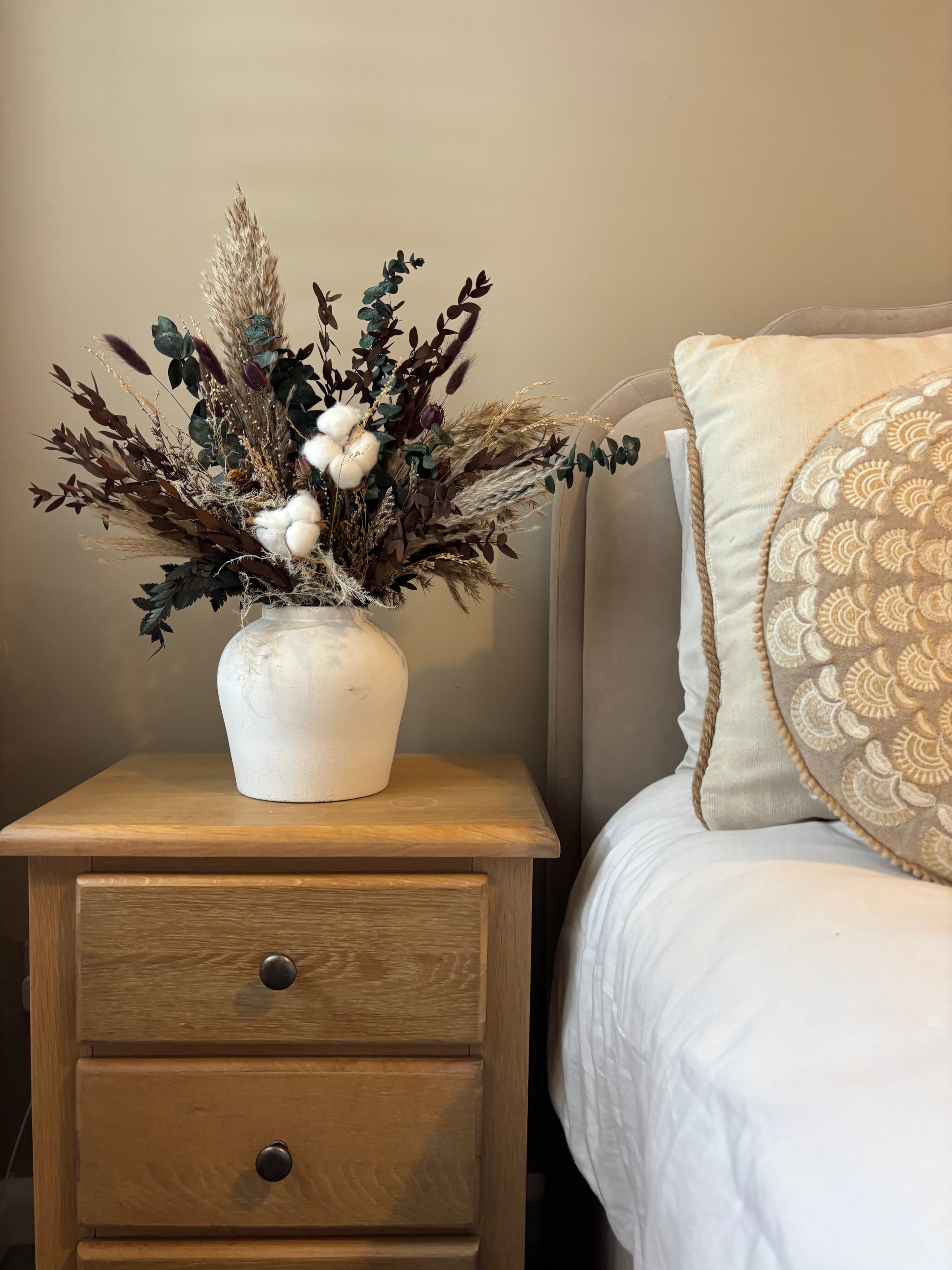 A cosy, rustic winter bouquet filled with deep earthy foliage, soft pampas, warm caramel tones and fluffy white cotton stems for a touch of seasonal comfort. Finished with hints of rich plum and natural textures, Winter Spice brings a warm, spiced-woodland feel to your home, perfect for creating a snug, inviting atmosphere throughout the colder months.